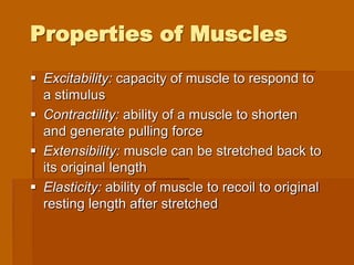 Muscles can stretch when needed. Myoglobin stores oxygen in muscle cells. It is the ability of the muscle to respond to a stimulus.